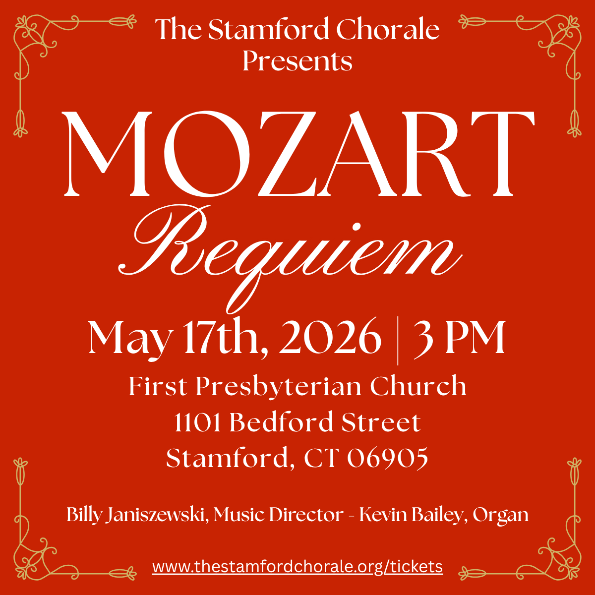 « All Events Add to calendar Google Calendar iCalendar Outlook 365 Outlook Live The Stamford Chorale Spring Concert May 17 @ 3:00 pm - 4:00 pm The Stamford Chorale presents a powerful program uniting 235 years of choral tradition. The concert features Mozart’s Requiem, his final and unfinished masterpiece, alongside the world premiere of “If …